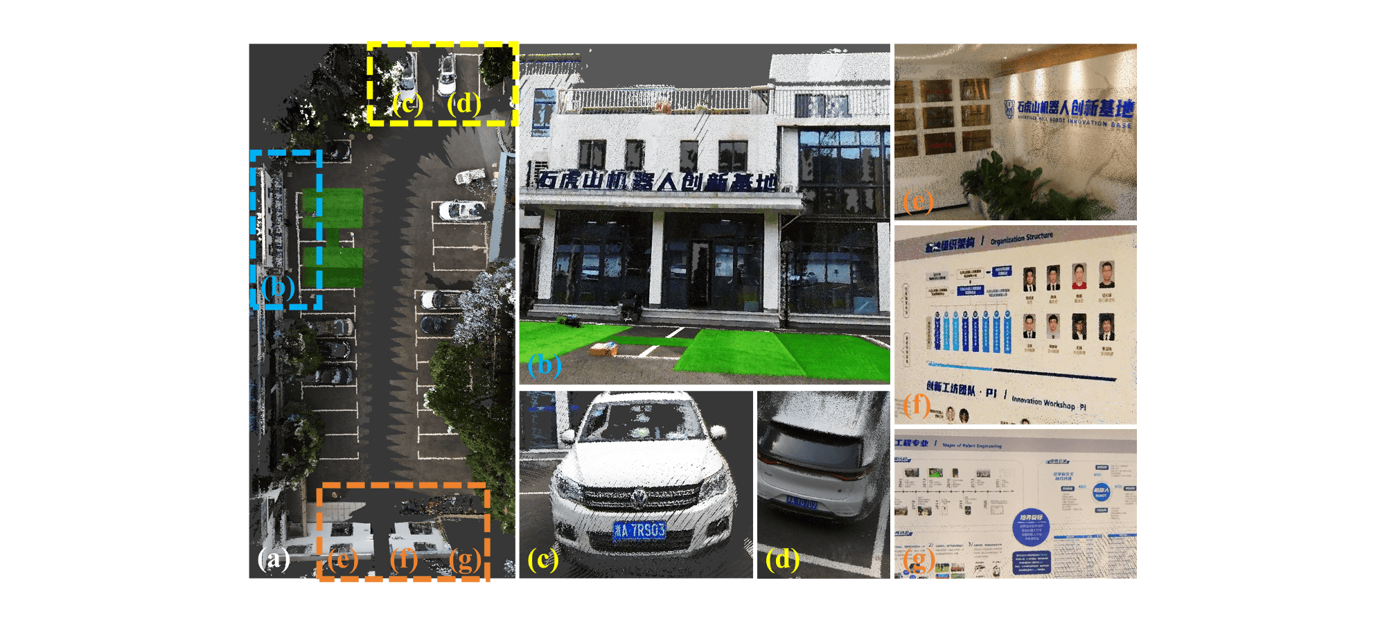 Our colorized point clouds accurately represent the 3D environment, capturing a wide range of outdoor (a)-(d) and indoor scenarios (e)-(g).