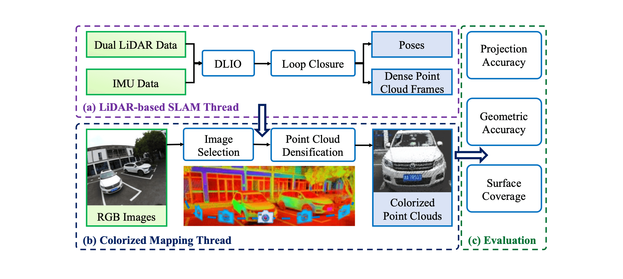 Our system consists of two threads: LiDAR-based SLAM and colorized mapping. The LiDAR-based SLAM utilizes data from two LiDAR sensors and an IMU to estimate poses at the frequency of the IMU and generate dense point clouds. The colorized mapping thread incorporates two innovative processes: image selection and point cloud densification. Additionally, we introduce a novel approach to evaluate the quality of colorized point clouds. This method integrates three important factors: projection accuracy, geometric accuracy, and surface coverage.